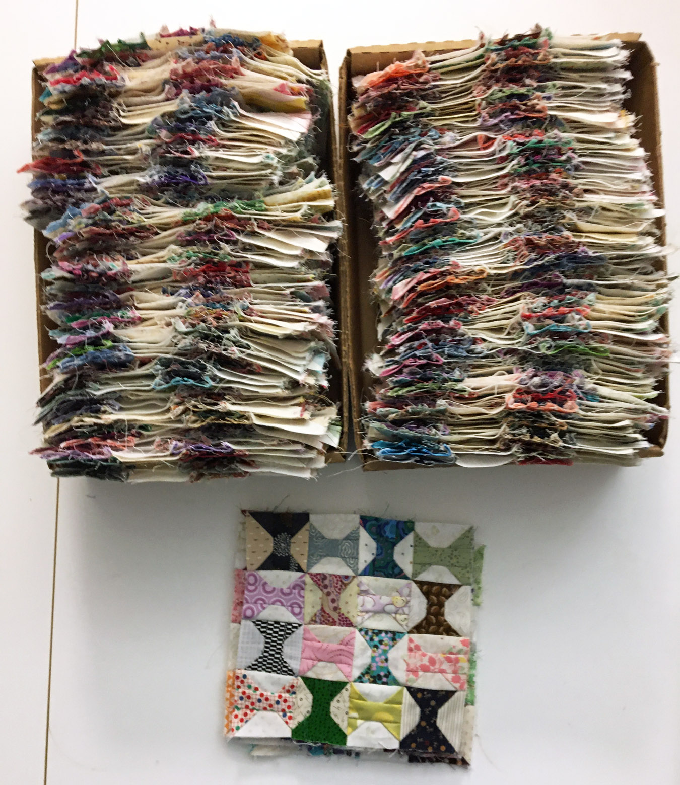 I took back my boxes and filled them with microspools. The next step is to sew them into four by four blocks. I did finally count them and I will have 144 six inch blocks. I can make a 72 inch square quilt, or a quilt that is 66 in by 78 in.